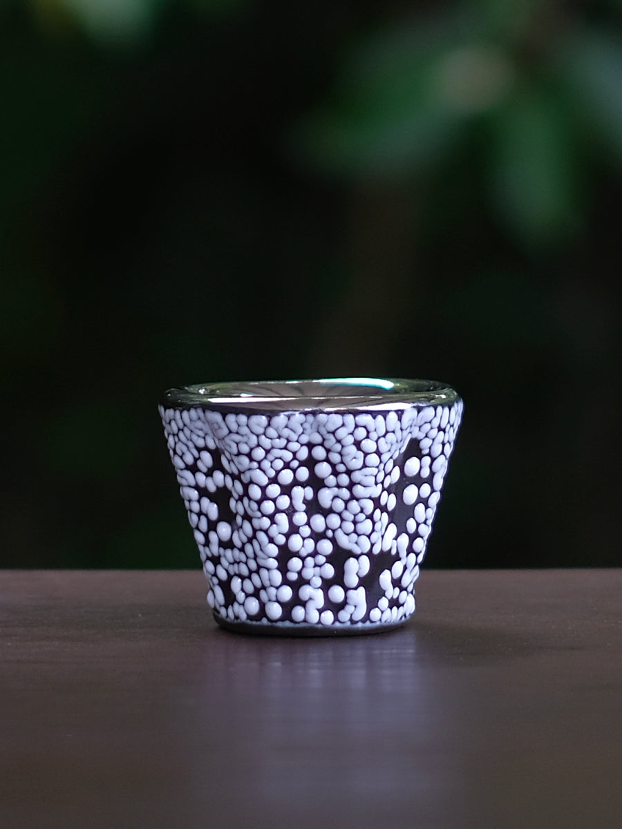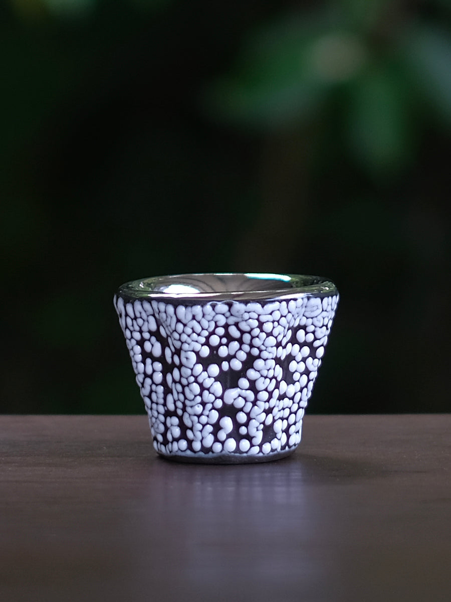 同梱の「S-presso Cup」は、今村能章氏が琉GINをイメージソースに制作した3色展開の器。代表作「Espresso Cup」をベースに、少量の蒸留酒をストレートやオンザロックで味わうために再構築されました。内側には純白金または純金を焼き付け、口当たりの滑らかさと上品な輝きを演出。常に愛用いただけるように持ち運びできる専用ケースも付属します。