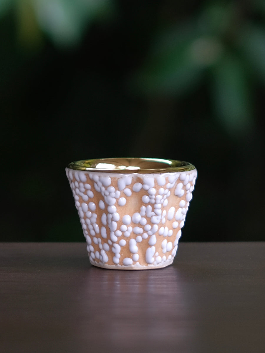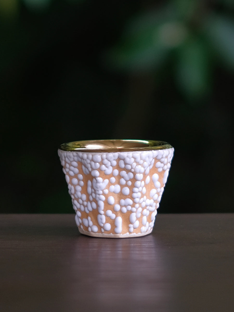 同梱の「S-presso Cup」は、今村能章氏が琉GINをイメージソースに制作した3色展開の器。代表作「Espresso Cup」をベースに、少量の蒸留酒をストレートやオンザロックで味わうために再構築されました。内側には純白金または純金を焼き付け、口当たりの滑らかさと上品な輝きを演出。常に愛用いただけるように持ち運びできる専用ケースも付属します。