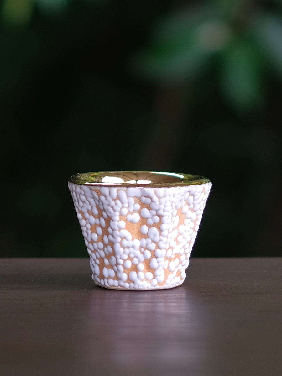 同梱の「S-presso Cup」は、今村能章氏が琉GINをイメージソースに制作した3色展開の器。代表作「Espresso Cup」をベースに、少量の蒸留酒をストレートやオンザロックで味わうために再構築されました。内側には純白金または純金を焼き付け、口当たりの滑らかさと上品な輝きを演出。常に愛用いただけるように持ち運びできる専用ケースも付属します。