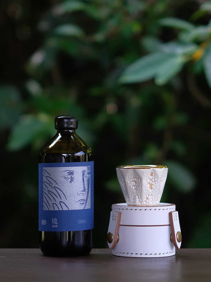沖縄を拠点に、飲むことにまつわる物事を探究する〈LIQUID〉が、開業8周年を記念して発表したスペシャルアソート。岐阜県郡上市の〈辰巳蒸留所〉と共同開発したクラフトジン「ALCHEMIAE 琉 New Moon GIN(琉GIN)」と、陶芸家・今村能章氏が制作した蒸留酒を嗜むための器「S-presso Cup」を組み合わせた特別仕様です。